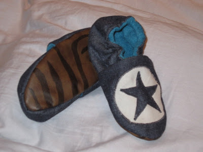 Comme je préfère toujours jouer avec les lapins plutôt que de faire le ménage, l'extérieur n'est pas en polaire (regrettable erreur de la version 1...) mais en jean. Mr Lutin avait demandé un dessin sur les rouges, je lui ai donc fait une jolie étoile (il demande depuis quelques temps les chaussures avec des étoiles comme Papoune et Mamoune, on verra ça l'été prochain).