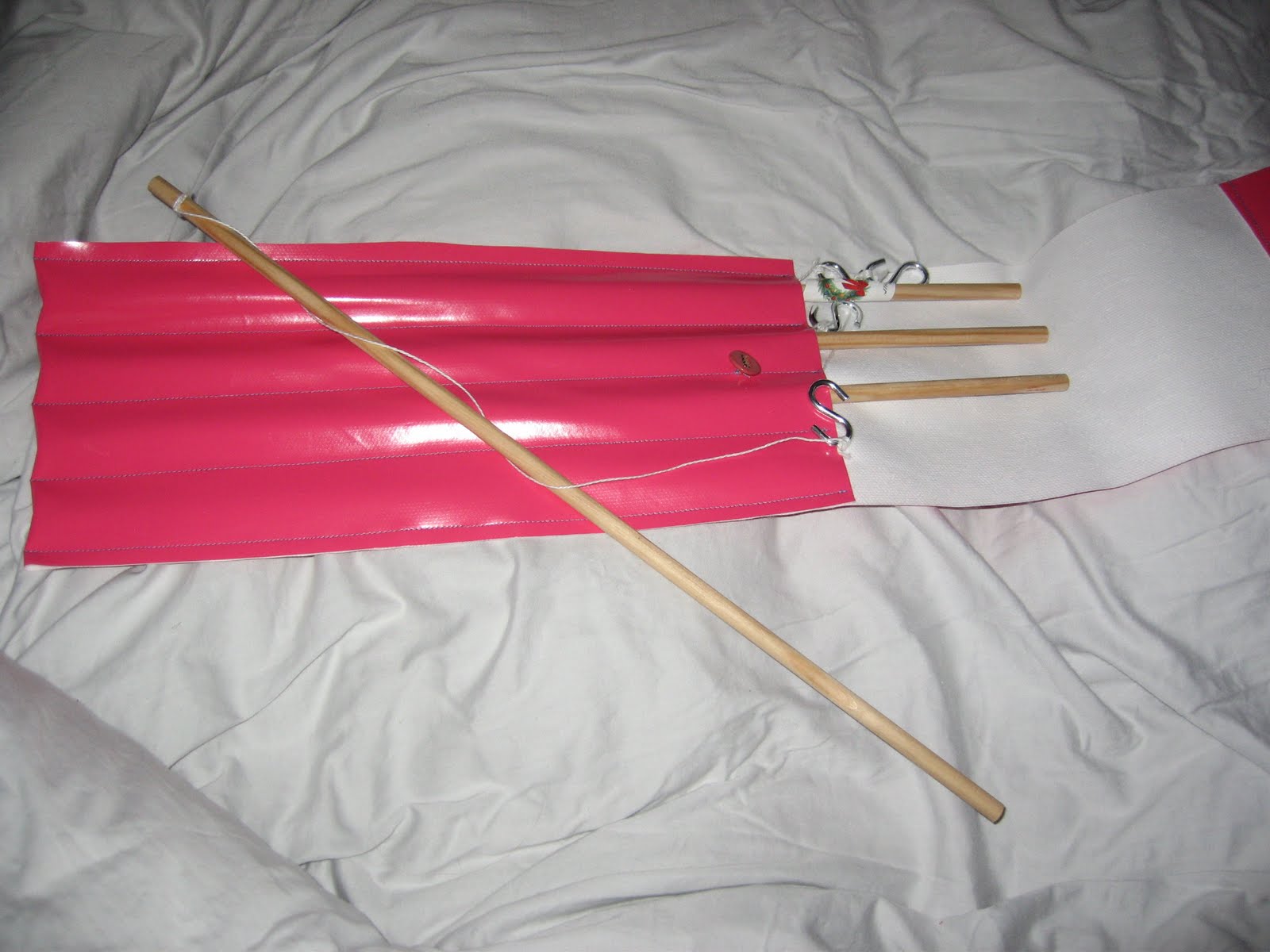 Et on y range quoi là dedans ? Les 4 cannes à pêche réalisées par Mr La Fée pour la fête des troizans du jeune homme. Depuis ce jour-là, pêcher à la ligne est une de nos activités fétiches, limite quasi quotidienne. D'ailleurs cela fait un moment qu'il la réclame sa trousse. Le Lutin sélectionne ce que nous allons pêcher (légos, bonshommes, chaussettes de sa sœur, petites voitures...), j'emballe et nous sortons le matos.