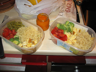 Pour le premier, le frigo n'était pas très plein, mais le menu a convenu à tout le monde, pas le temps d'aller faire les courses avant de partir. Mlle Z avait conservé son menu de la semaine d'avant, potimarron, aucun soucis même froid... Mr Lutin ayant boudé ma suggestion sur les œufs durs, ça a été omelette, avocat, tomate, pates, haricots verts.